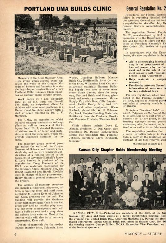 The masonry group several years ago raised the walls of the Oregon Museum of Science and Industry in a single day and recently completed construction of a fall-out shelter in the basement of Governor Hatfield's home. E. Lyle Parsley is president of the organization. Doug Remmick of the UMA was materials coordinator for the Guidance Clinic Masonry Bee, and Robert Raymond and Harold Hawkins were in charge of labor procurement. Henry Mason is general contractor for the project.