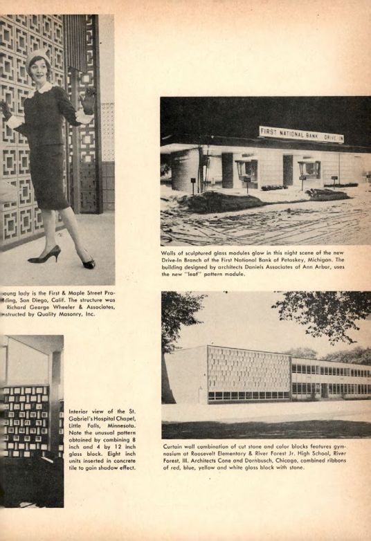 Walls of sculptured glass modules glow in this night scene of the new Drive-In Branch of the First National Bank of Petoskey, Michigan. The building, designed by architects Daniels Associates of Ann Arbor, uses the new "leaf" pattern module.