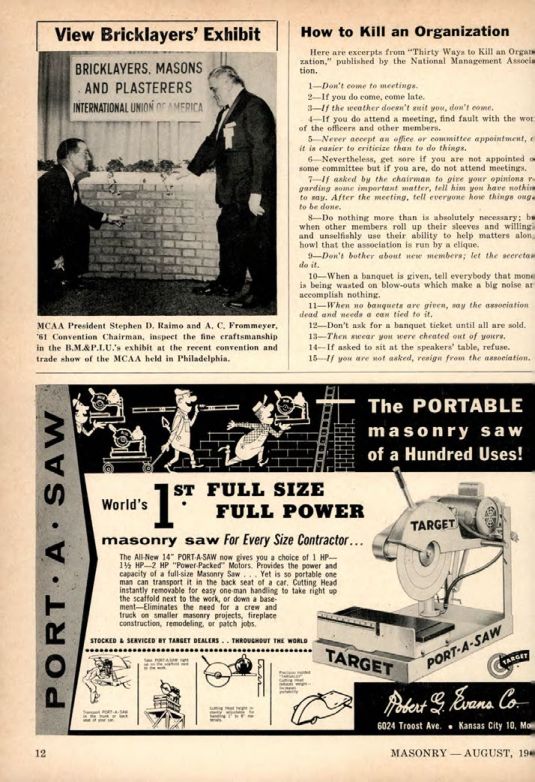 MCAA President Stephen D. Raimo and A. C. Frommeyer, '61 Convention Chairman, inspect the fine craftsmanship in the B.M.&P.I.U.'s exhibit at the recent convention and trade show of the MCAA held in Philadelphia.
