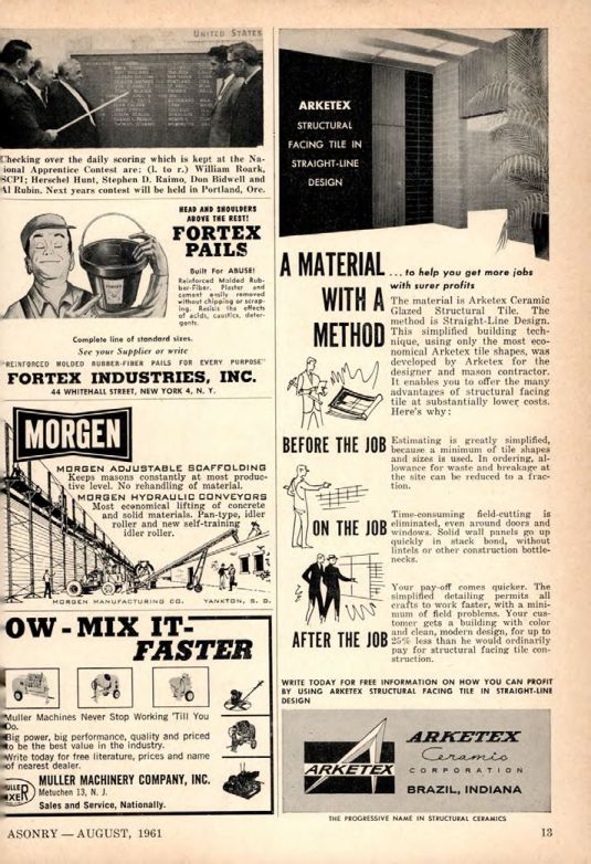 The material is Arketex Ceramic Glazed Structural Tile. The method is Straight-Line Design. This simplified building technique, using only the most economical Arketex tile shapes, was developed by Arketex for the designer and mason contractor. It enables you to offer the many advantages of structural facing tile at substantially lower costs. Here's why: