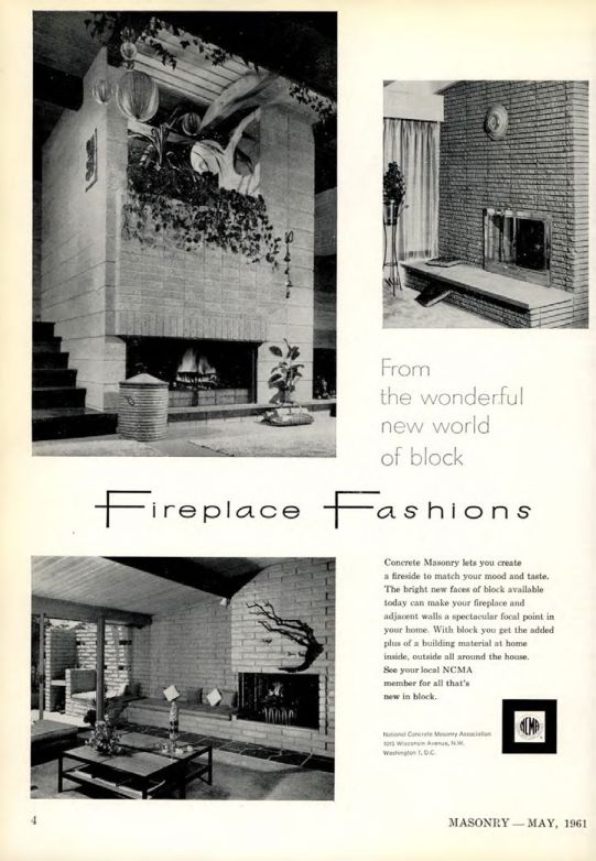 Concrete Masonry lets you create a fireside to match your mood and taste. The bright new faces of block available today can make your fireplace and adjacent walls a spectacular focal point in your home. With block you get the added plus of a building material at home inside, outside all around the house. See your local NCMA member for all that's new in block.