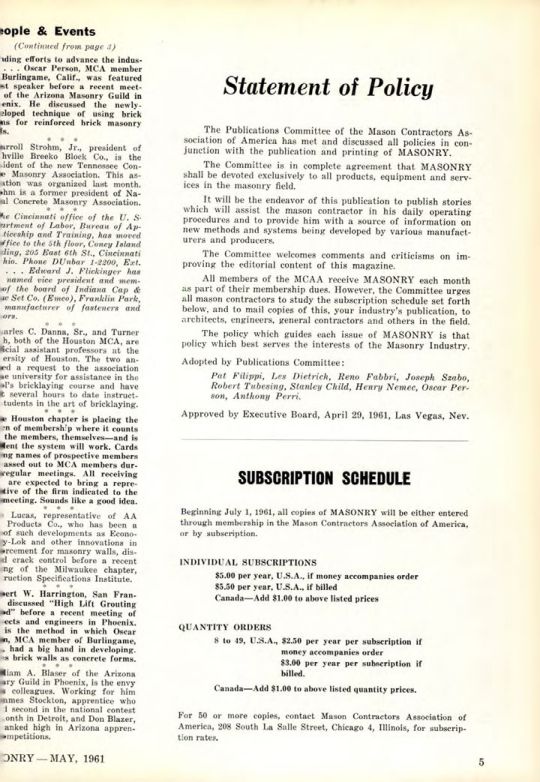 The Publications Committee of the Mason Contractors Association of America has met and discussed all policies in conjunction with the publication and printing of MASONRY.