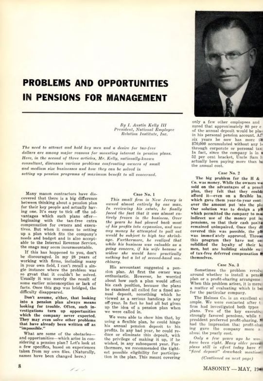 Many mason contractors have discovered that there is a big difference between thinking about a pension plan for their key people and actually having one. It's easy to tick off the advantages which such plans offer- beginning with the tax-free extra compensation for owners and executives. But when it comes to setting up a plan which fits the company's needs and budget and is also acceptable to the Internal Revenue Service, the snags may seem insurmountable.
