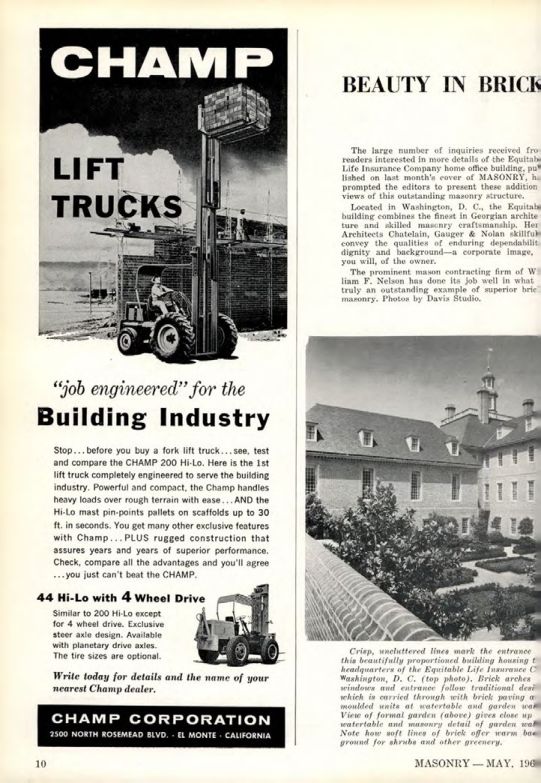 Located in Washington, D. C., the Equitable building combines the finest in Georgian architecture and skilled masonry craftsmanship. Here Architects Chatelain, Gauger & Nolan skillfully convey the qualities of enduring dependability, dignity and background-a corporate image, if you will, of the owner.
