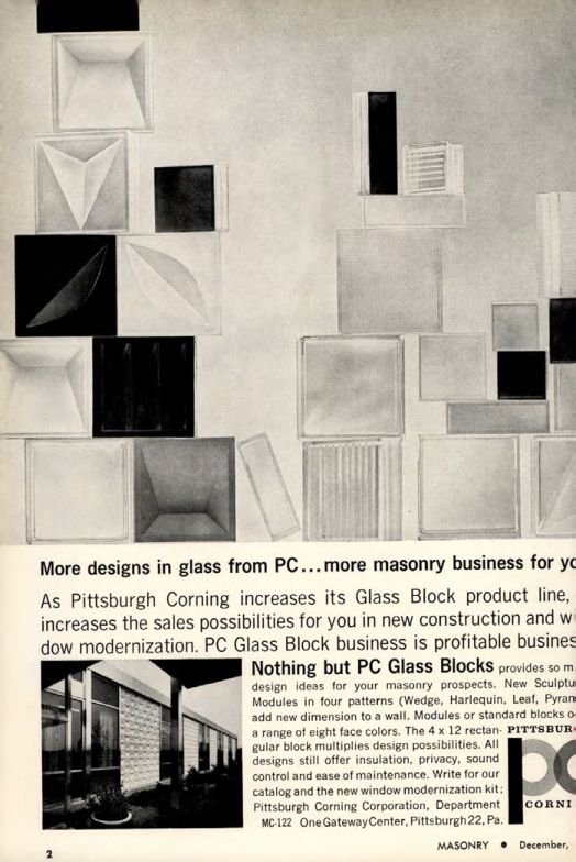 New Sculptured Modules in four patterns (Wedge, Harlequin, Leaf, Pyramid) add new dimension to a wall. Modules or standard blocks offer a range of eight face colors. The 4 x 12 rectangular block multiplies design possibilities. All designs still offer insulation, privacy, sound control and ease of maintenance. Write for our catalog and the new window modernization kit; Pittsburgh Corning Corporation, Department MC-122 One Gateway Center, Pittsburgh 22, Pa.