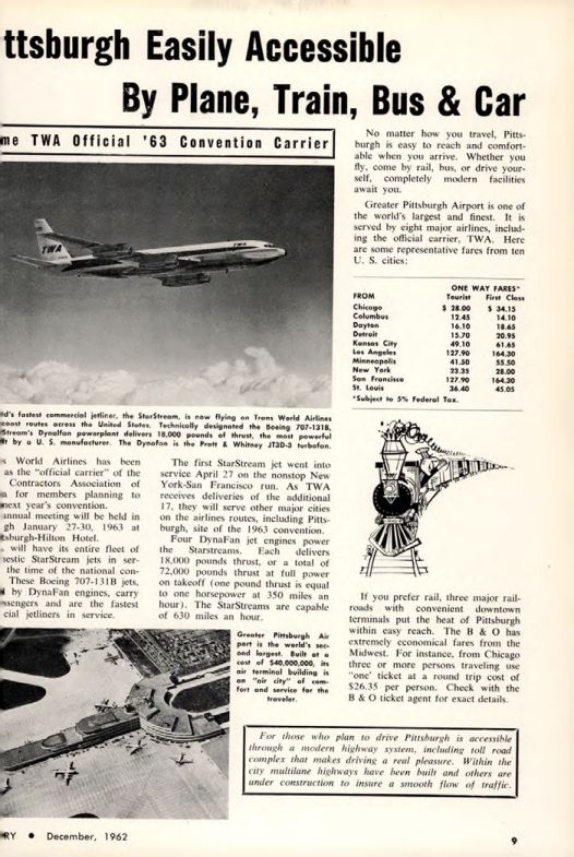 Trans World Airlines has been designated as the "official carrier" of the Contractors Association of America for members planning to attend next year's convention. The annual meeting will be held in Pittsburgh January 27-30, 1963 at the Pittsburgh-Hilton Hotel.