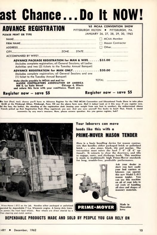 The last (final, tool) chance you'll have to Advance Register for the 1963 MCAA Convention and Educational Trade Show to take place 26-30 at the Pittsburgh Hilton, Pittsburgh, Penn. Fill out the above form now. Mail it today! Look at it this way: If you register now, avoid the fuss, the bother, the standing at the registration desk (tossing your weight from one foot to another), the embarrassed silence as friends picked up their Registration Pack (They registered, you see). And you save yourself five bucks to boot! That, friend, is sound economics by any man's measure. Now, please answer question: Are you gonna register, huh?