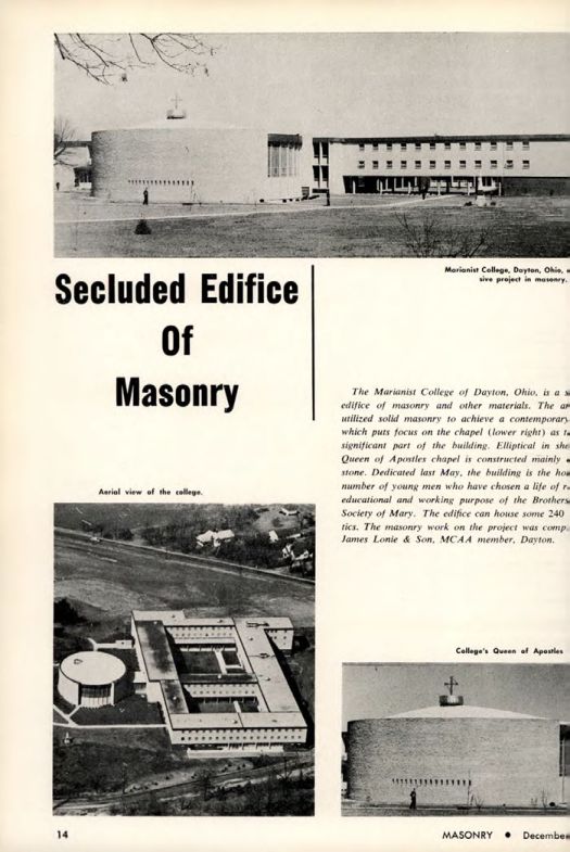 The Marianist College of Dayton, Ohio, is a sive project in masonry and other materials. The architecture utilized solid masonry to achieve a contemporary design, which puts focus on the chapel (lower right) as the most significant part of the building. Elliptical in shape, the Queen of Apostles chapel is constructed mainly of stone. Dedicated last May, the building is the home to a number of young men who have chosen a life of religious, educational and working purpose of the Brothers of the Society of Mary. The edifice can house some 240 clerics. The masonry work on the project was completed by James Lonie & Son, MCAA member, Dayton.