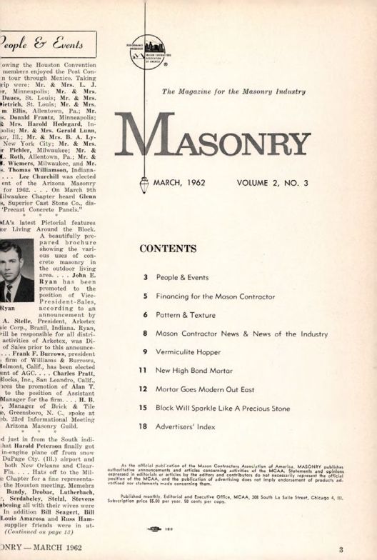 Lee Churchill was elected president of the Arizona Masonry Guild for 1962. On March 9th the Milwaukee Chapter heard Glenn Boyer, Superior Cast Stone Co., discuss "Precast Concrete Panels."