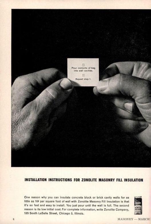 One reason why you can insulate concrete block or brick cavity walls for as little as 10 per square foot of wall with Zonolite Masonry Fill Insulation is that it's so fast and easy to install. You just pour until the wall is full. The second reason is its low initial cost. For complete information, write Zonolite Company, 135 South LaSalle Street, Chicago 3, Illinois.