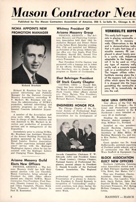 Richard M. Branham has been appointed Advertising and Publicity Manager for the National Concrete Masonry Association, succeeding W. P. Markert. Mr. Branham will continue the administration of NCMA's promotion, national advertising and publicity programs as well as the biennial Concrete Industries Exposition.