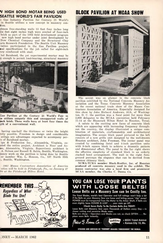 Gas Industry Pavilion for Century 21 World's in Seattle utilizes a new concept in masonry construction. Eighteen free-standing walls 13 feet four inches long six feet eight inches high were erected of four-inch brick as part of the 1962 field development program new high bond mortar under joint development by Dow Chemical Company and the Structural Clay acts Research Foundation. The Seattle Unit Masonry Association participated in the Gas Pavilion project. Final specifications for the job called for eight-inch masonry reinforced with steel. Called Sarabond, the yet experimental mortar may be strong enough to permit load-bearing, structural masonry.