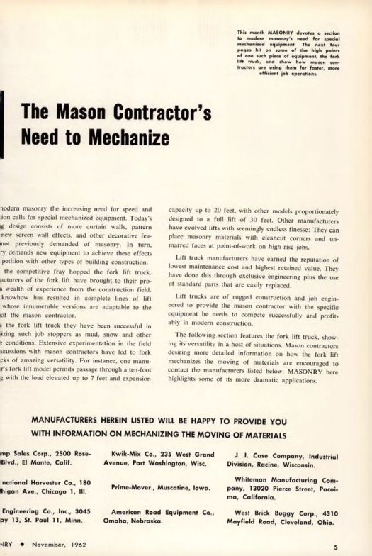 This month MASONRY devotes a section to modern masonry's need for special mechanized equipment. The next four pages hit on some of the high points of one such piece of equipment, the fork lift truck, and show how mason contractors are using them for faster, more efficient job operations.