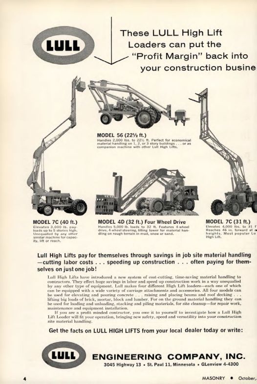 Lull High Lifts have introduced a new system of cost-cutting, time-saving material handling to contractors. They effect huge savings in labor and speed up construction work in a way unequalled by any other type of equipment. Lull makes four different High Lift loaders-each one of which can be equipped with a wide variety of carriage attachments and accessories. All four models can be used for elevating and pouring concrete raising and placing beams and roof decking lifting big loads of brick, mortar, block and lumber. For on the ground material handling they can be used for loading and unloading, stacking and piling materials, for site cleanup-for repair work, maintenance and equipment installation.