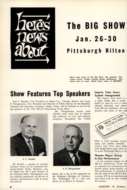 Here's more news on the Big Show: Top speakers, Time Inquiry Savers, Sunday evening theater performance. And there's more to come. Watch future issues of MASONRY.