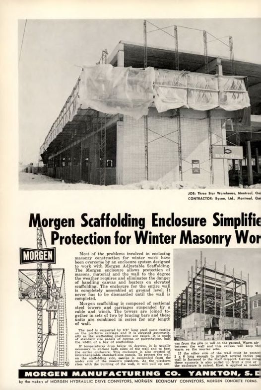 Most of the problems involved in enclosing masonry construction for winter work have been overcome by an enclosure system designed to work with Morgen Adjustable Scaffolding. The Morgen enclosure allows protection of masons, material and the wall to the degree the weather requires and eliminates the danger of handling canvas and heaters on elevated scaffolding. The enclosure for the entire wall is completely assembled at ground level. It never has to be dismantled until the wall is completed.