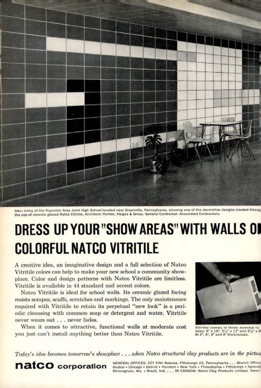 Natco Vitritile is ideal for school walls. Its ceramic glazed facing resists scrapes, scuffs, scratches and markings. The only maintenance required with Vitritile to retain its perpetual "new look" is a periodic cleansing with common soap or detergent and water. Vitritile never wears out . . . never fades.