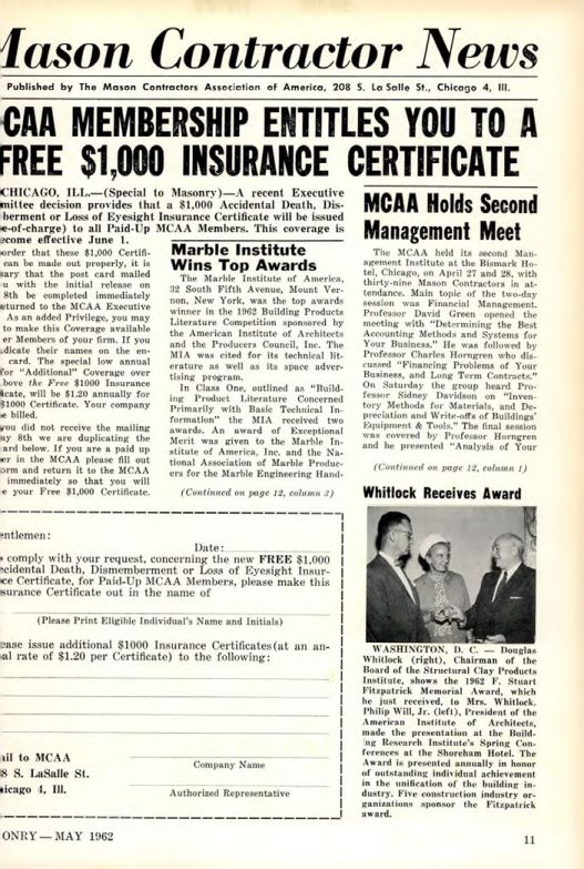 The Marble Institute of America, 32 South Fifth Avenue, Mount Vernon, New York, was the top awards winner in the 1962 Building Products Literature Competition sponsored by the American Institute of Architects and the Producers Council, Inc. The MIA was cited for its technical literature as well as its space advertising program.