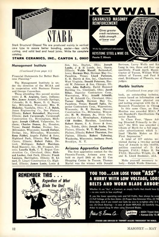 The first apprentice contest for the Phoenix-Tucson, Arizona area was held on April 28th at the El Con Shopping Center in Tucson. Thomas Martel was the winner with Donald Bertram, Larry Wolfe and Ke Lang in two, three and four respectively. Frank April, Mason contractor of Tucson, William Wilde, architect of Tucson, and Paul E steel, Bricklayer of Phoenix, were the judges.