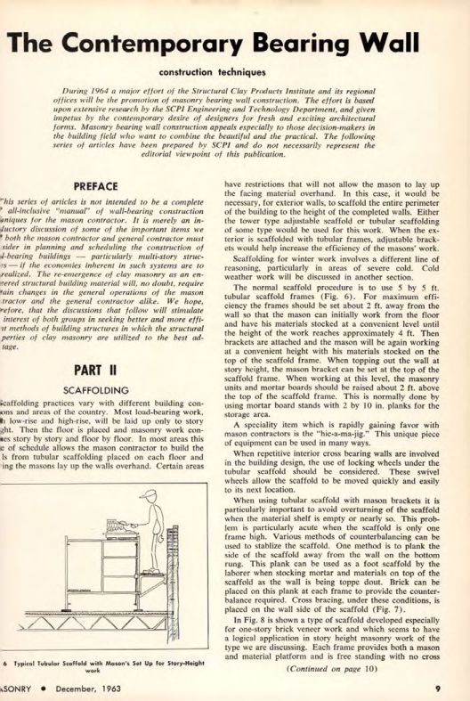 This series of articles is not intended to be a complete all-inclusive "manual" of wall-bearing construction techniques for the mason contractor. It is merely an introductory discussion of some of the important items we both the mason contractor and general contractor must consider in planning and scheduling the construction of wall-bearing buildings -particularly multi-story structures- if the economies inherent in such systems are to be realized. The re-emergence of clay masonry as an engineered structural building material will, no doubt, require certain changes in the general operations of the mason contractor and the general contractor alike. We hope, therefore, that the discussions that follow will stimulate the interest of both groups in seeking better and more efficient methods of building structures in which the structural properties of clay masonry are utilized to the best advantage.