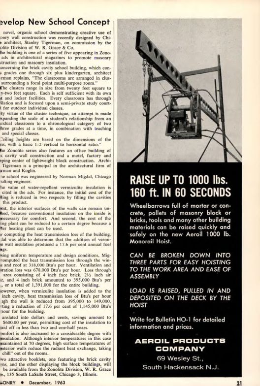 The building is one of a series of five appearing in Zonolite ads in architectural magazines to promote masonry construction and masonry insulation.