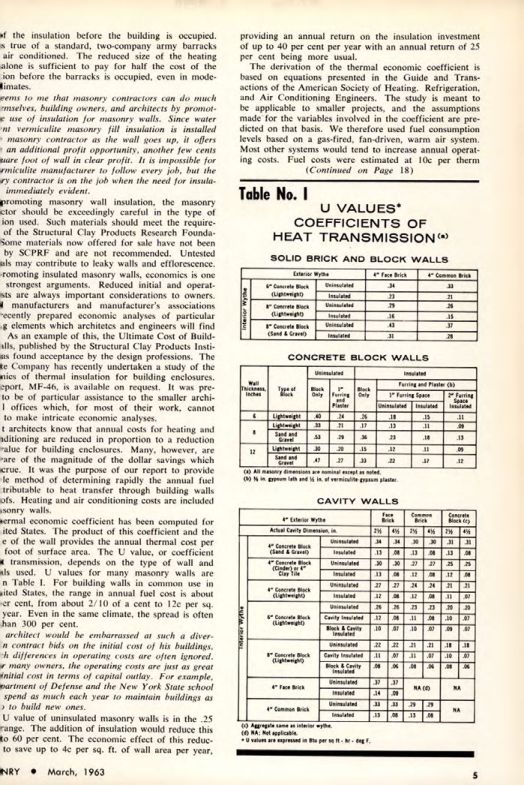 A thermal economic coefficient has been computed for the United States. The product of this coefficient and the U value of the wall provides the annual thermal cost per square foot of surface area. The U value, or coefficient of heat transmission, depends on the type of wall and materials used. U values for many masonry walls are given in Table I. For building walls in common use in the United States, the range in annual fuel cost is about 60 per cent, from about 2/10 of a cent to 12c per sq. ft. per year. Even in the same climate, the spread is often more than 300 per cent.