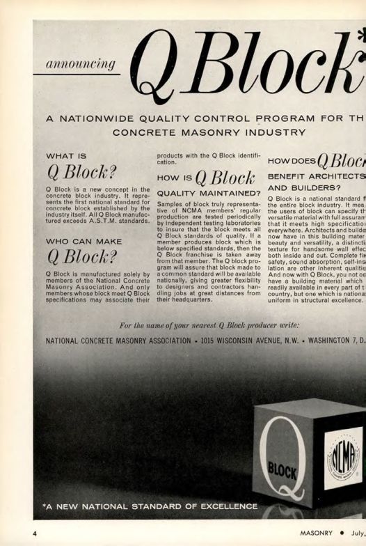Samples of block truly representative of NCMA members regular production are tested periodically by independent testing laboratories to insure that the block meets all Q Block standards of quality. If a member produces block which is below specified standards, then the Q Block franchise is taken away from that member. The Q block program will assure that block made to a common standard will be available nationally, giving greater flexibility to designers and contractors handling jobs at great distances from their headquarters.