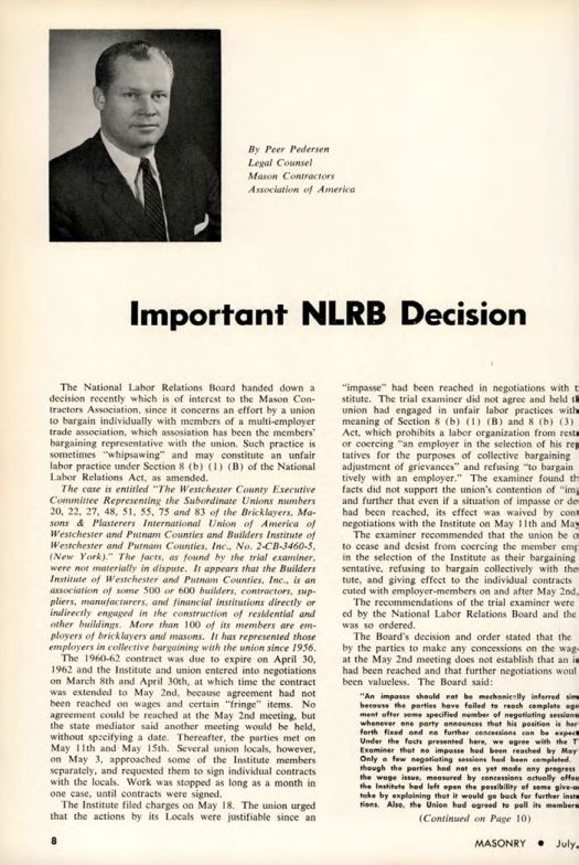 The National Labor Relations Board handed down a decision recently which is of interest to the Mason Contractors Association, since it concerns an effort by a union to bargain individually with members of a multi-employer trade association, which association has been the members' bargaining representative with the union. Such practice is sometimes "whipsawing" and may constitute an unfair labor practice under Section 8 (b) (1) (B) of the National Labor Relations Act, as amended.