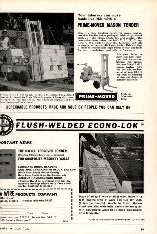 Ask your dealer to show you how easily your hod carriers or laborers can operate this new Model L-812 mason tender. You can use this machine on all of your jobs to cut costs of handling all sizes and shapes of masonry materials.