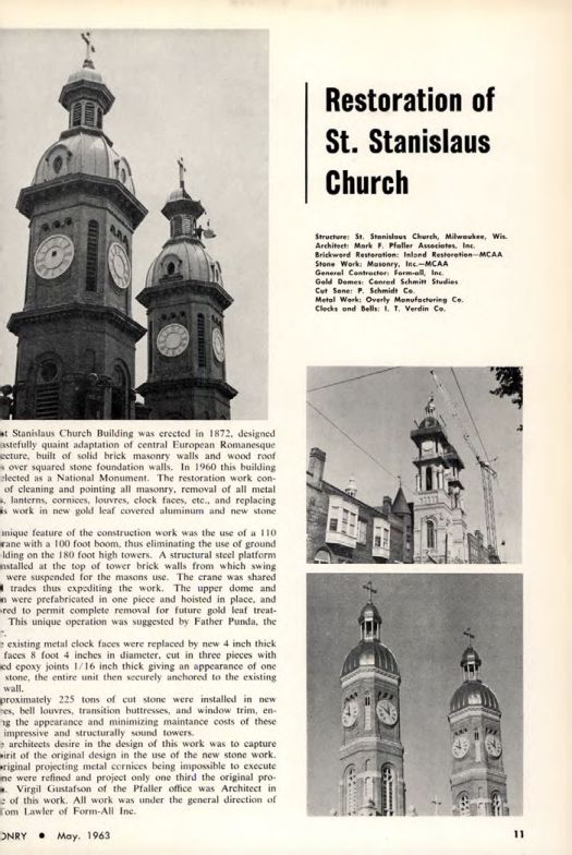 St. Stanislaus Church Building was erected in 1872, designed as a tastefully quaint adaptation of central European Romanesque architecture, built of solid brick masonry walls and wood roof over squared stone foundation walls. In 1960 this building was selected as a National Monument. The restoration work consisted of cleaning and pointing all masonry, removal of all metal, lanterns, cornices, louvres, clock faces, etc., and replacing this work in new gold leaf covered aluminum and new stone.