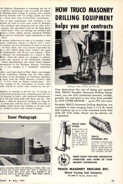 Their greatest achievement to date is in creating a trend to masonry windowless schools or schools with a maximum of windows and the elimination of metal or pre-cast panels. In Clare, Mich., they were directly responsible for changing a new school design from window and panel construction to brickmasonry with 20 per cent windows. Their greatest influence was demonstrated on a school in Midland, Mich., where the school was designed in ordinary construction and, because of the information furnished the school superintendent and school board engineer representatives of the Michigan Masonry Promotion Team, it was changed to a completely windowless building.