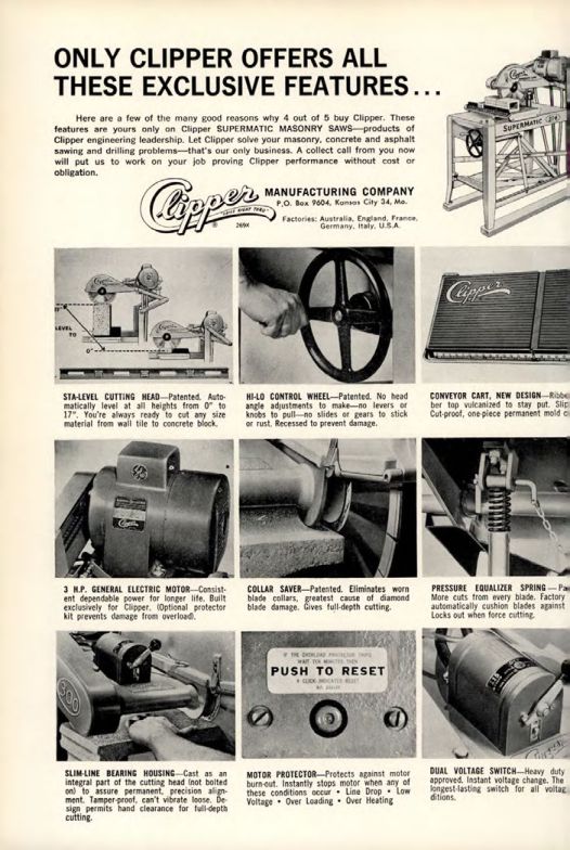 Here are a few of the many good reasons why 4 out of 5 buy Clipper. These features are yours only on Clipper SUPERMATIC MASONRY SAWS-products of Clipper engineering leadership. Let Clipper solve your masonry, concrete and asphalt sawing and drilling problems-that's our only business. A collect call from you now will put us to work on your job proving Clipper performance without cost or obligation.