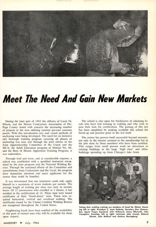 During the later part of 1963 the officers of Local 56, Illinois, and the Mason Contractors Association of Du-Page County noted with concern the increasing number of projects in the area utilizing exterior pre-cast concrete panels. With this introduction new and varied methods of anchoring were being developed. The need for an intensive and thorough training program covering all phases of anchoring was seen and through the joint efforts of the Joint Apprenticeship Committee of the Union and the MCA; the Adult Education program of District No. 88; and the State of Illinois Apprentice Training Program, it was undertaken.