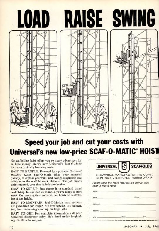 No scaffolding hoist offers you so many advantages for so little money. Here's how Universal's Scaf-O-Matic increases profits by lowering costs: