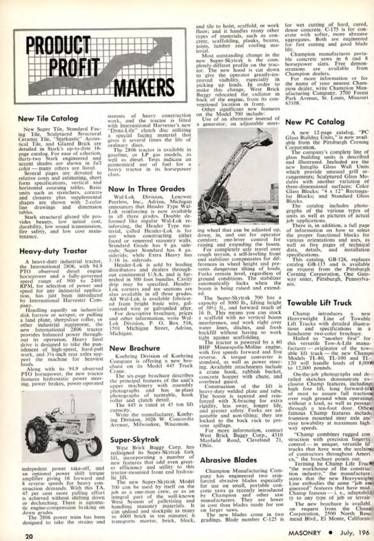 The new Super-Skytrak Model 700 can be used by itself on the job as a one-man crew, or as an integral part of the well-known West System of palletizing and handling masonry materials. It can unload and stockpile as many as 4000 brick in ten minutes; it transports mortar, brick, block, and tile to hoist, scaffold, or work floor; and it handles many other types of materials, such as concrete, scaffolding, planks, beams, joists, lumber and roofing material.