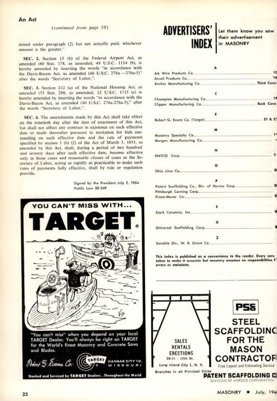 This index is published as a convenience to the reader. Every care taken to make it accurate but masonry assumes no responsibilities for errors or omissions.