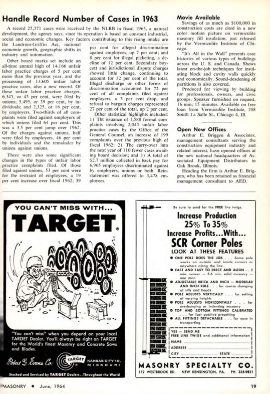 Other board marks set include an all-time annual high of 14,166 unfair labor practice charges, 5 per cent more than the previous year, and the processing of 13,605 unfair labor practice cases, also a new record. Of these unfair labor practice charges, 6,345, or 45 per cent, were filed by unions; 5,495, or 39 per cent, by individuals; and 2,325, or 16 per cent, by employers. Two-thirds of all complaints were filed against employers of which unions filed 64 per cent. This was a 3.5 per cent jump over 1962. Of the charges against unions, half were filed by employers, 46 per cent by individuals and the remainder by unions against unions.
