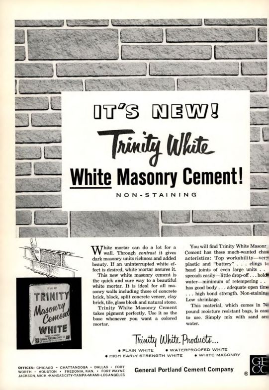 You will find Trinity White Masonry Cement has these much-wanted characteristics: Top workability-very plastic and "buttery", clings to head joints of even large units, spreads easily-little drop-off... holds water-minimum of retempering, has good body, adequate open time, high bond strength. Non-staining. Low shrinkage.