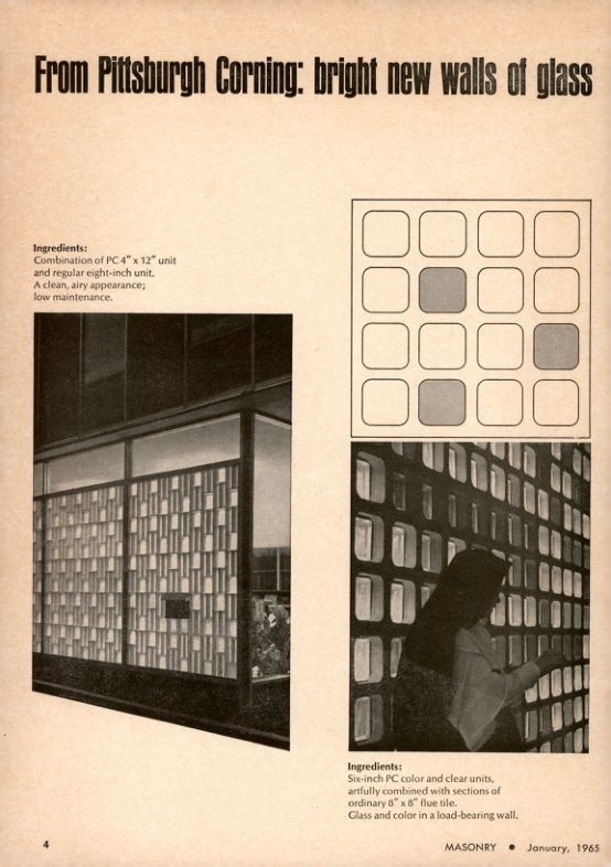 Six-inch PC color and clear units, artfully combined with sections of ordinary 8" x 8" flue tile. Glass and color in a load-bearing wall.