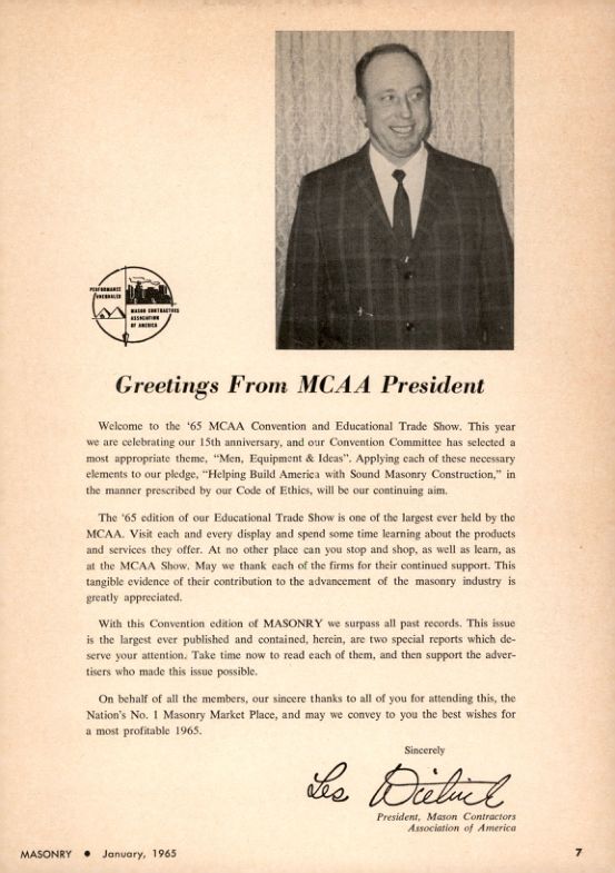Welcome to the '65 MCAA Convention and Educational Trade Show. This year we are celebrating our 15th anniversary, and our Convention Committee has selected a most appropriate theme, "Men, Equipment & Ideas". Applying each of these necessary elements to our pledge, "Helping Build America with Sound Masonry Construction," in the manner prescribed by our Code of Ethics, will be our continuing aim.