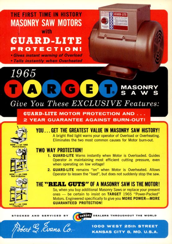 1965 TARGET MASONRY SAWS Give You These EXCLUSIVE Features: GUARD-LITE MOTOR PROTECTION AND 2 YEAR GUARANTEE AGAINST BURN-OUT!