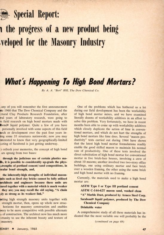 Many of you will remember the first announcement in late 1960 that The Dow Chemical Company and the Structural Clay Products Research Foundation, after several years of laboratory research, were going to begin field research on high bond mortars made with high bond liquid polymer. Quite a few of you have been personally involved with some aspects of this field research or development over the past four years including some 35 structures nationwide; now you may be interested to know that very geographically-limited marketing of Sarabond is just getting underway.