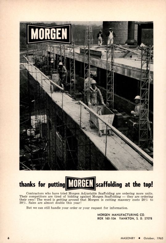 Contractors who have tried Morgen Adjustable Scaffolding are ordering more units. Their competitors are tired of bidding against Morgen Scaffolding and are ordering their own! The word is getting around that Morgen is cutting masonry costs 20% to 30%. Sales are almost double this year!