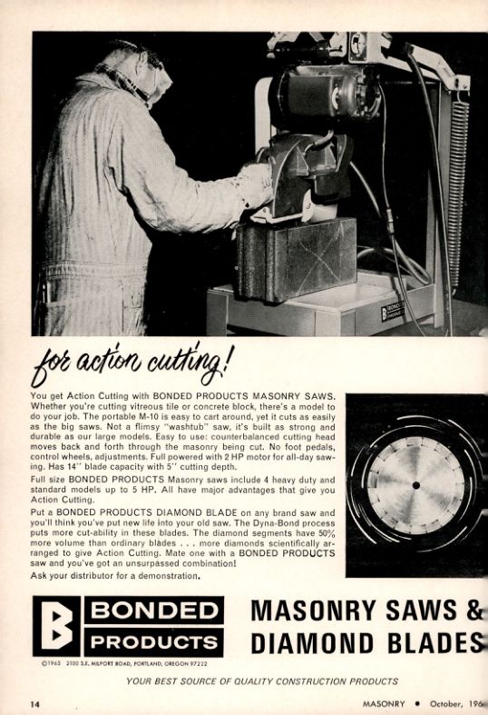 You get Action Cutting with BONDED PRODUCTS MASONRY SAWS. Whether you're cutting vitreous tile or concrete block, there's a model to do your job. The portable M-10 is easy to cart around, yet it cuts as easily as the big saws. Not a flimsy "washtub" saw, it's built as strong and durable as our large models. Easy to use: counterbalanced cutting head moves back and forth through the masonry being cut. No foot pedals, control wheels, adjustments. Full powered with 2 HP motor for all-day sawing. Has 14" blade capacity with 5" cutting depth.