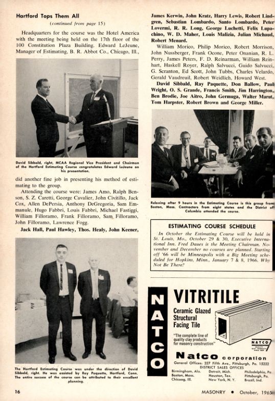 Headquarters for the course was the Hotel America with the meeting being held on the 17th floor of the 100 Constitution Plaza Building. Edward LeJeune, Manager of Estimating. B. R. Abbot Co., Chicago, III., James Kerwin, John Kratz, Harry Lewis, Robert Lindgren, Sebastian Lombardo, Santo Lombardo, Peter Lovermi, R. R. Long, George Luchetti, Felix Lupachino, W. D. Maher, Louis Malizia, Julian Michaud, Robert Menard. William Morico, Philip Morico, Robert Morrison, John Nussberger, Frank Ocone, Peter Onanian, R. L. Perry, James Peters, F. D. Reinarman, William Reinhart, Haskell Royer, Ralph Salvucci, Guido Salvucci, G. Scranton, Ed Scott, John Tubbs, Charles Velardo, Gerald Vaudreuil, Robert Weidlich, Howard West. David Sibbald, Ray Paquette, Don Ballow, Paul Wright, O. S. Grande, Francis Smith, Jim Harrington, Ben Brodie, Joe Aitro, John Germuga, Walter Marut, Tom Harpster, Robert Brown and George Miller.
