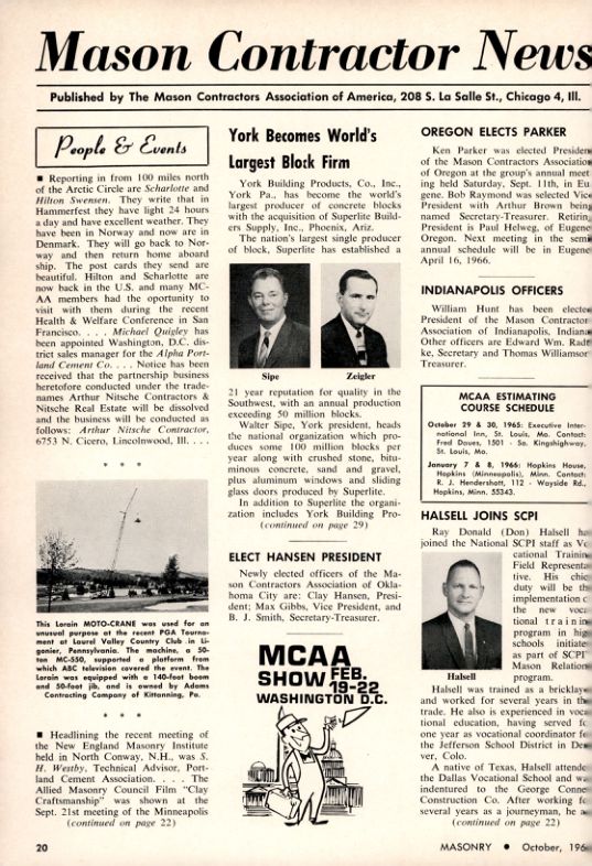 Ken Parker was elected President of the Mason Contractors Association of Oregon at the group's annual meeting held Saturday, Sept. 11th, in Eugene. Bob Raymond was selected Vice President with Arthur Brown being named Secretary-Treasurer. Retiring President is Paul Helweg, of Eugene, Oregon. Next meeting in the semi-annual schedule will be in Eugene April 16, 1966.