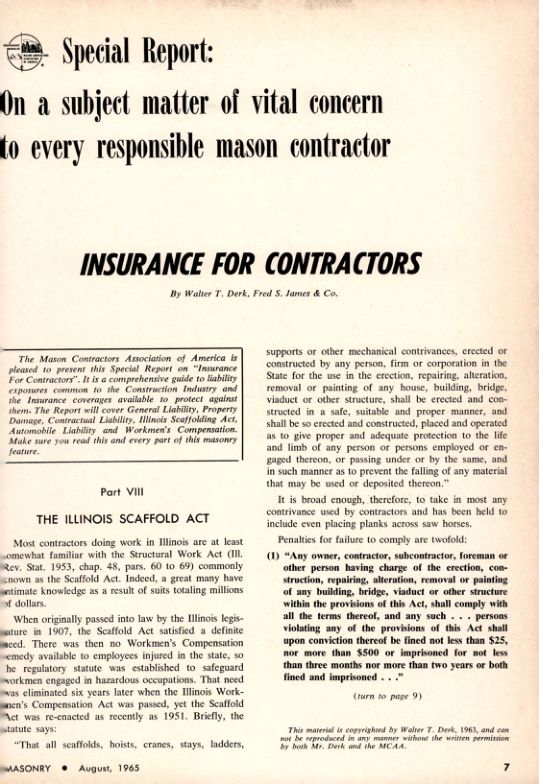 The Mason Contractors Association of America is pleased to present this Special Report on "Insurance For Contractors". It is a comprehensive guide to liability exposures common to the Construction Industry and the Insurance coverages available to protect against them. The Report will cover General Liability, Property Damage, Contractual Liability, Illinois Scaffolding Act, Automobile Liability and Workmen's Compensation. Make sure you read this and every part of this masonry feature.