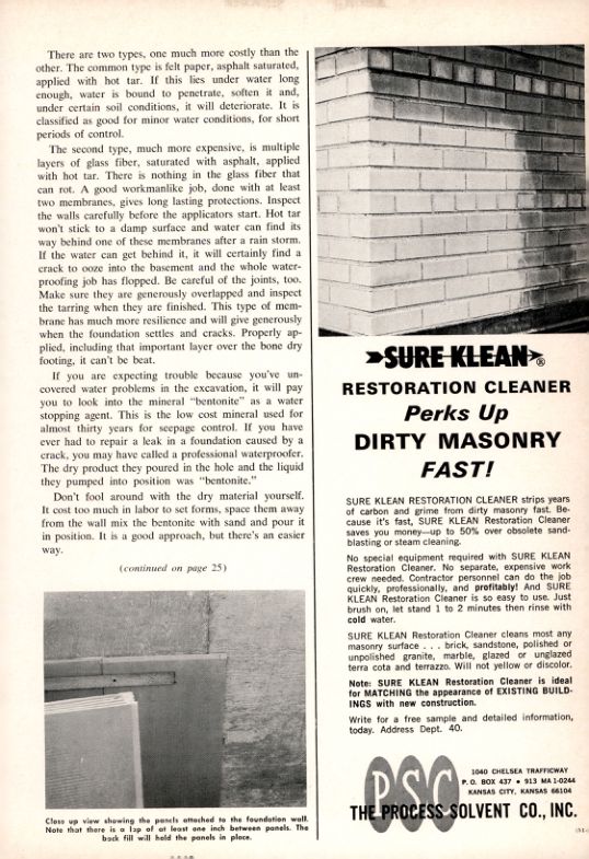 The second type, much more expensive, is multiple layers of glass fiber, saturated with asphalt, applied with hot tar. There is nothing in the glass fiber that can rot. A good workmanlike job, done with at least two membranes, gives long lasting protections. Inspect the walls carefully before the applicators start. Hot tar won't stick to a damp surface and water can find its way behind one of these membranes after a rain storm. If the water can get behind it, it will certainly find a crack to ooze into the basement and the whole water-proofing job has flopped. Be careful of the joints, too. Make sure they are generously overlapped and inspect the tarring when they are finished. This type of membrane has much more resilience and will give generously when the foundation settles and cracks. Properly applied, including that important layer over the bone dry footing, it can't be beat.