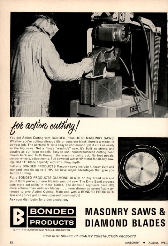 Put a BONDED PRODUCTS DIAMOND BLADE on any brand saw and you'll think you've put new life into your old saw. The Dyna-Bond process puts more cut-ability in these blades. The diamond segments have 50% more volume than ordinary blades more diamonds scientifically arranged to give Action Cutting. Mate one with a BONDED PRODUCTS saw and you've got an unsurpassed combination! Ask your distributor for a demonstration.