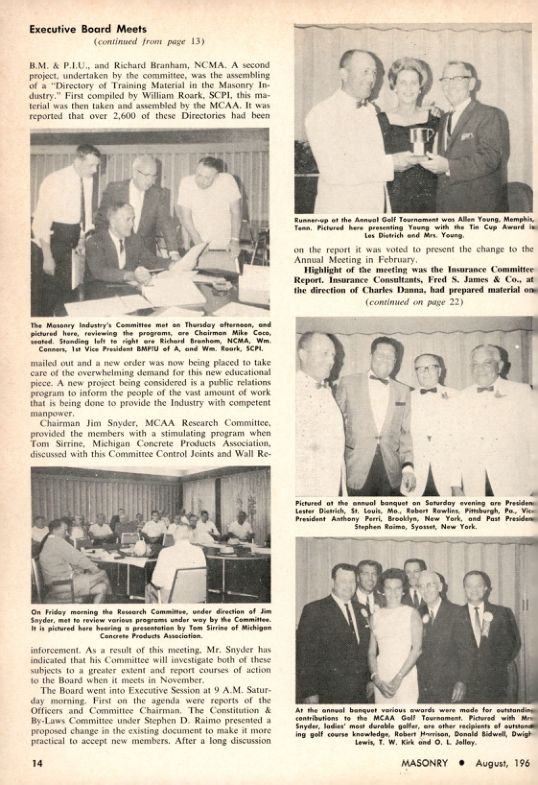 Chairman Jim Snyder, MCAA Research Committee, provided the members with a stimulating program when Tom Sirrine, Michigan Concrete Products Association, discussed with this Committee Control Joints and Wall Reinforcement. As a result of this meeting. Mr. Snyder has indicated that his Committee will investigate both of these subjects to a greater extent and report courses of action to the Board when it meets in November.
